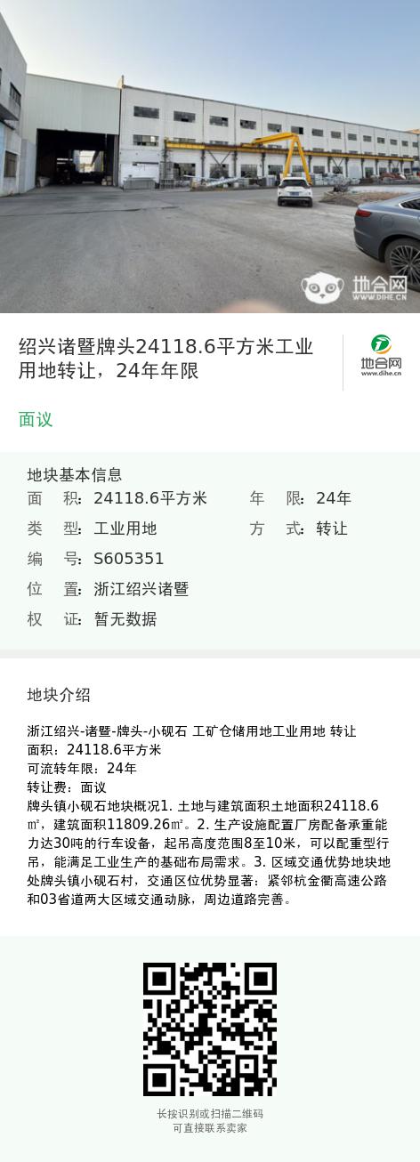 绍兴诸暨牌头24118.6平方米工业用地转让,24年年限